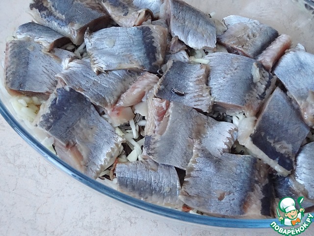 Разделайте сельдь на филе без кожи. Свежая сельдь разделывется также, как и соленая. Порежьте крупнами кусками. Растворите в 0,5 литра воды соль и сахар, залейте маринадом, оставьте минут на 40. Можно воспользоваться уже готовым филе малосольной сельди.