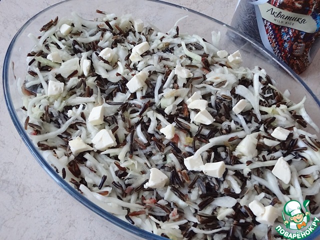 Сверху остатки капусты с яблоком и рисом. Порежьте масло кусочками и разбросайте по поверхности. Накройте посуду крышкой и тушите в духовке около часа при Т 190С. Возможно, понадобится чуть больше времени.