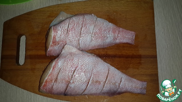 Затем на рыбе делаем продольные надрезы с обеих сторон.