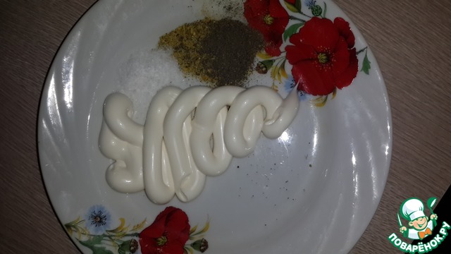 Ну а теперь займемся приготовлением соуса. смешиваем соль, перец, приправу для рыбы и майонез.