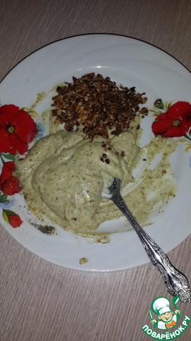 Фундук обжариваем на небольшом количестве оливкового масла до легкого жаренного вкуса. В блендере мелко крошим его и добавляем к предыдущим ингредиентам соуса. все еще раз тщательно перемешиваем.
