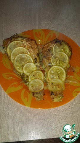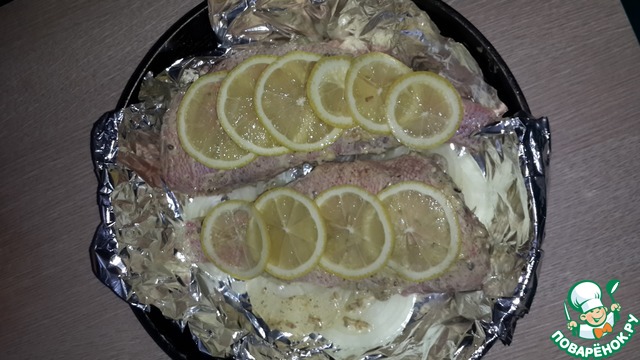 Натираем тщательно окуня готовым соусом, выкладываем в сковороду на луковую подушку и сверху кладем тонкие ломтики лимона.