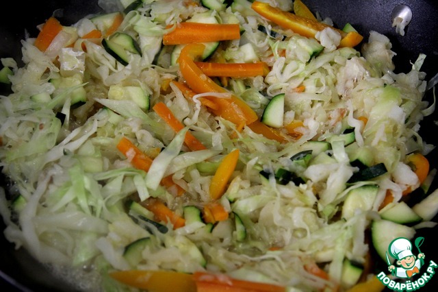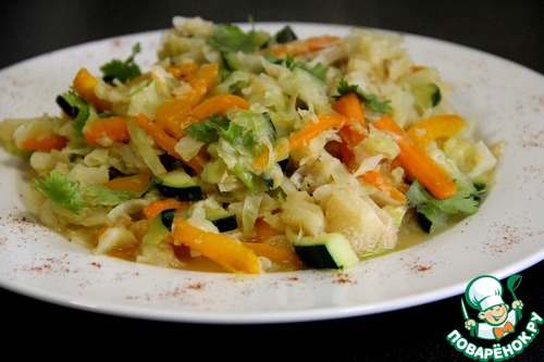 Капусту мелко нашинковать, перец и морковь нарезать тонкими полосками, кабачок полосками или кубиками. Добавить к рыбе и потушить при закрытой крышке около 5 минут.