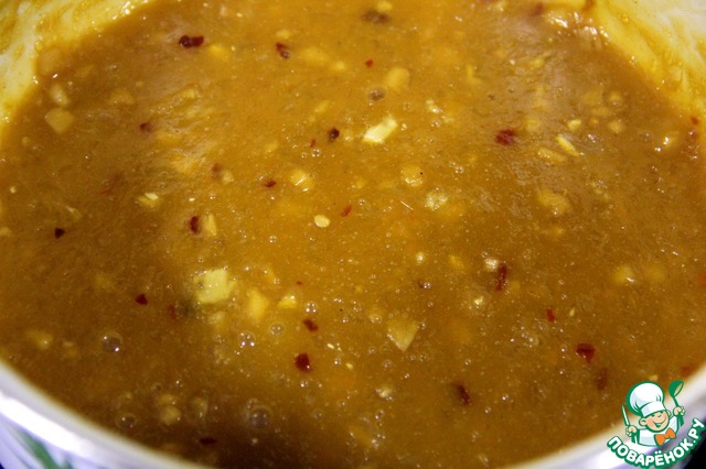 Тем временем готовим соус. Для этого добавляем в сок измелченный красный острый перец и продолжаем кипятить примерно 10 минут.
