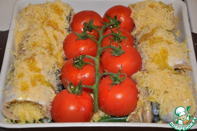 На широкую часть филе выложить сырную начинку, свернуть рулетиком и закрепить зубочисткой. Выложить рулетики и помидоры на фасоль. Если начинка осталась - можно присыпать рулетики сверху, после запекания получится хрустящая корочка. Сбрызнуть оливковым маслом.
