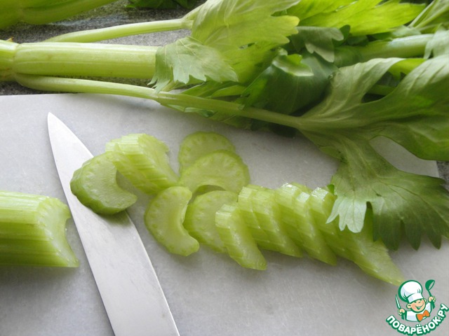 Сельдерей нарезать тонкими кружочками наискосок и бланшировать 1 мин. в соленой воде. Обдать холодной водой.