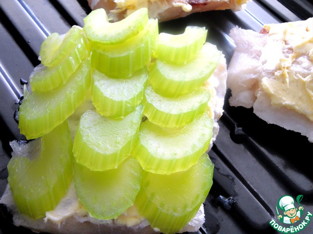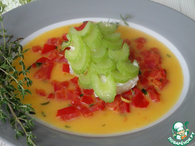 Рыбу посолить и поперчить, намазать лимонным маслом и выложить поверх кружочки сельдерея. Рыбу выложить в форму для запекания, подлить немного бульона и запечь 8-10 мин. при 190°C.