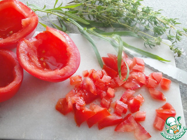 Помидоры разрезать пополам, удалить семена и нарезать мелкими кусочками.