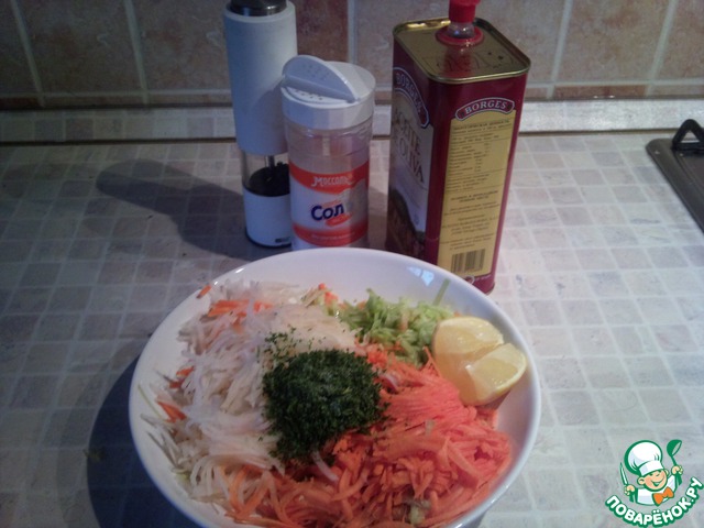 Овощи режем соломкой или трем на крупной терке. Добавляем мелко порезанную зелень. Солим. Перчим. Добавляем ложку масла (чтоб усвоился каротин из морковки) и заправляем соком половины лимона.