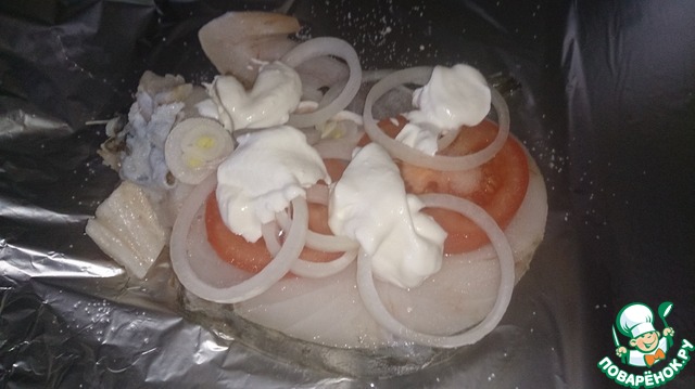 Размороженный стейк уложить на фольгу по центру прямоугольника, посолив с обеих сторон. Сверху положить колесико помидора, посолить, колечки лука, сметану.