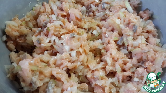 Мелко порубить рыбу, можно конечно и на мясорубке, но мы любим порубленную.
