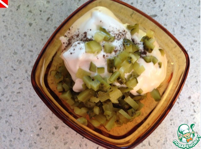 Для соуса смешиваем сметану, майонез и мелко нарезанные маринованные огурчики, черный перец. Конечно, рецепт соуса уже не итальянский, а скорее далеко адаптированный домашний, но поверьте, с рыбкой в самый раз.