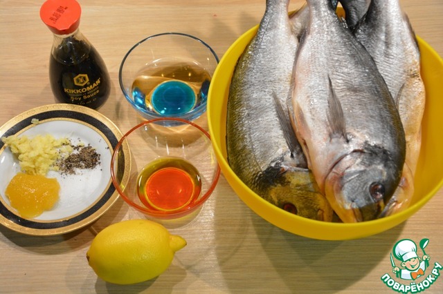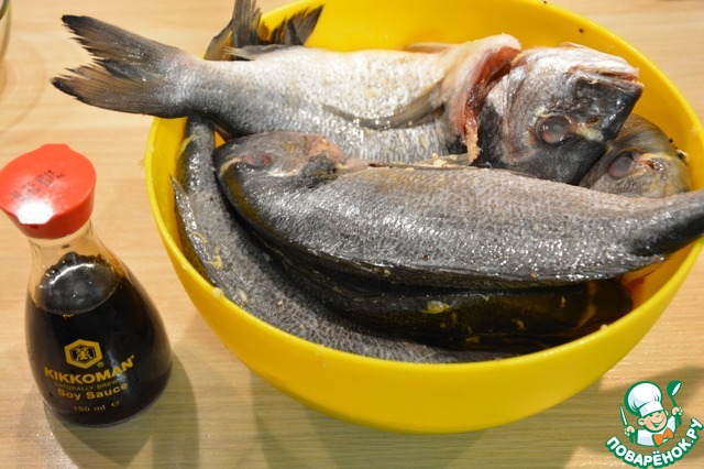 Соевый соус КИККОМАН, сок лимона, имбирь, сухое белое вино, мед, соль, перец смешать вместе. Рыбу хорошенько полить маринадом (внутри, снаружи) и оставить мариноваться на пол часа (можно больше).