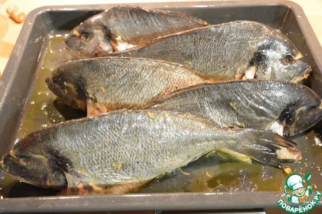 Разогреть духовку до 200С, смазать противень оливковым маслом, выложить рыбу (можно как у меня на картинке, а можно на одну сторону, как обычно) и отправить рыбу в духовку на самый нижний уровень на 30-40 минут.