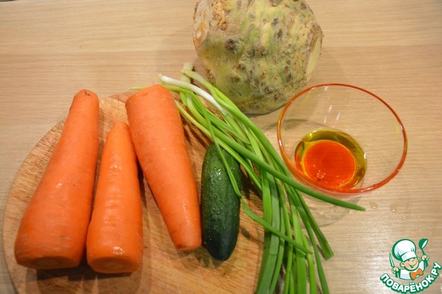 Готовим гарнир. Морковь и сельдерей почистить, огурец и лук помыть.
