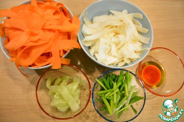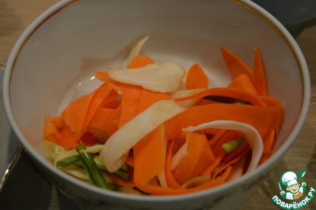 Морковь, сельдерей, огурец нарезать ленточками (можно соломкой, можно просто теркой - это всего лишь подача), лук нарезать перьями.