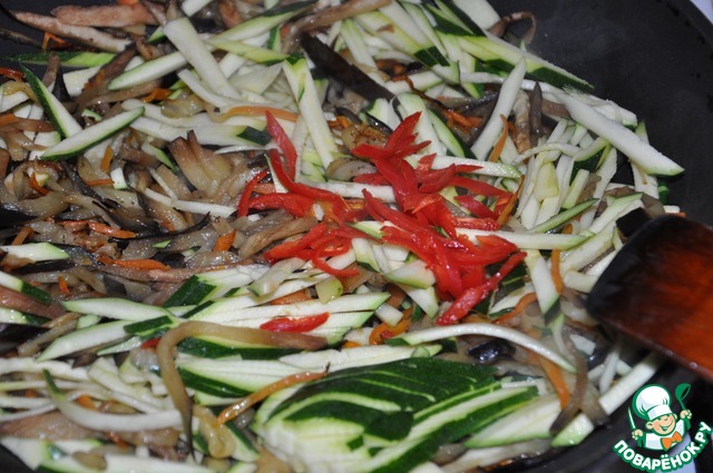 Добавить остальные порезанные овощи, перец, немного обжарить.