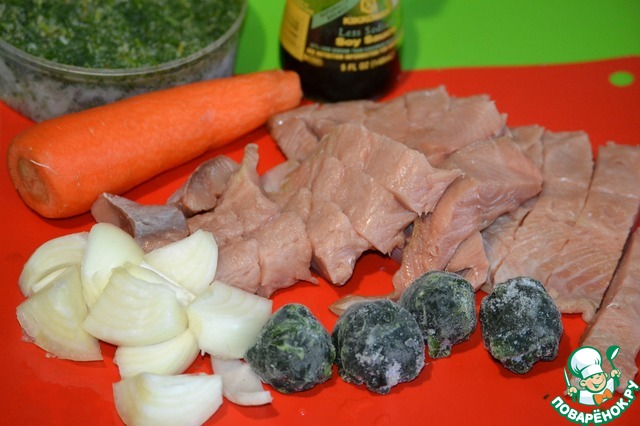 Приготовим все продукты для фарша. Филе нарезаем кусочками, морковь брусками, лук на четвертинки. Шпинат мороженный немного измельчаем.