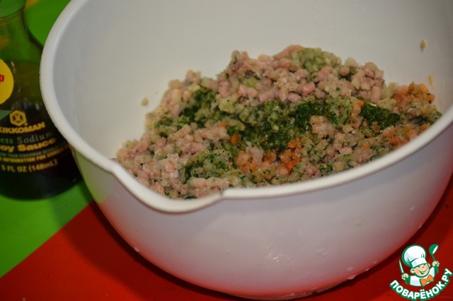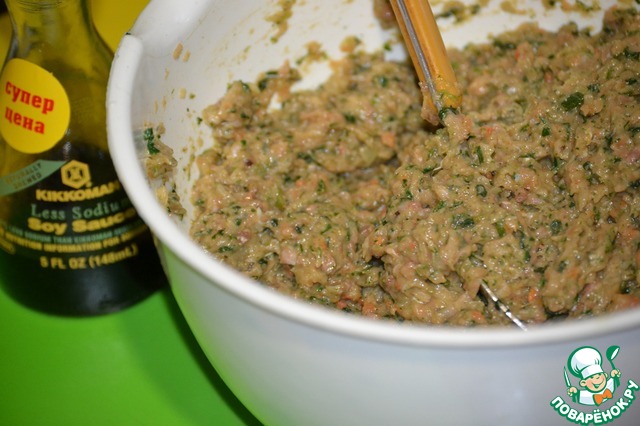 В готовый фарш добавляем соевый соус Kikkoman, соль, перец, имбирь, любые травки и специи, которые любите.