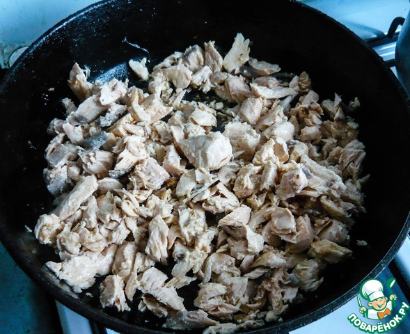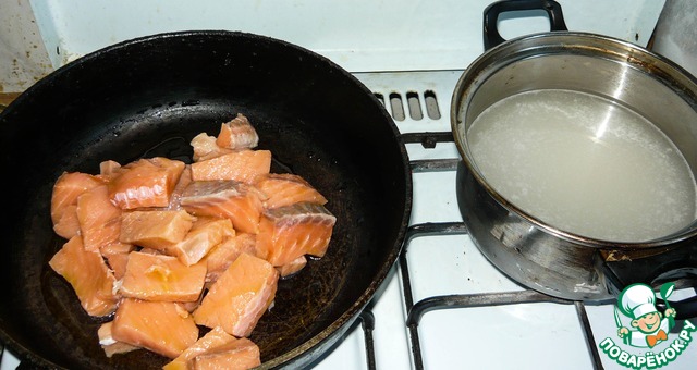 Как только лосось меняет цвет, т. е. становится мягче, разминаем его лопаткой или ложкой.