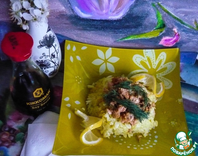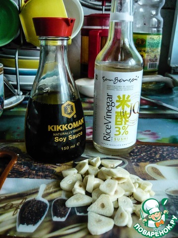 Смешиваем чеснок, кайен, приправу для рыбы. Добавляем 2 ст. л ложки соевого соуса kikkoman и 1 ст. л. рисового уксуса. Солить или не солить, решайте сами. Я немного подсолила.