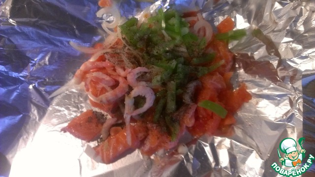 Креветки очистить. Рыбку, лук, перец б., помидор (очищенный от кожуры) нарезать, как Вам нравится. Все посолить, поперчить, добавить масло, завернуть в фольгу и поставить в разогретую духовку (200 гр.) На минут 15-20.
