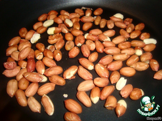 Орехи обжарить на сухой сковороде в течении одной-двух минут. Чистить не обязательно.