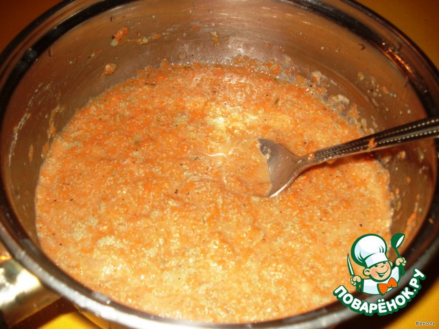 Икру пропустить через мясорубку, чтоб извлечь из нее всякие оболочки, пленки. Морковь и лук потереть на мелкой терке. Все смешать с яйцом, специями и мукой. Муки много не надо, чтоб не были блинчики жесткими.
