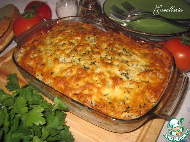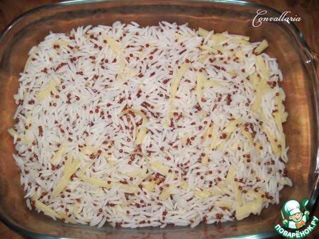 Сырно-рисовую массу поделить поровну. Одну часть выложить ровным слоем в жаропрочную форму для запекания.