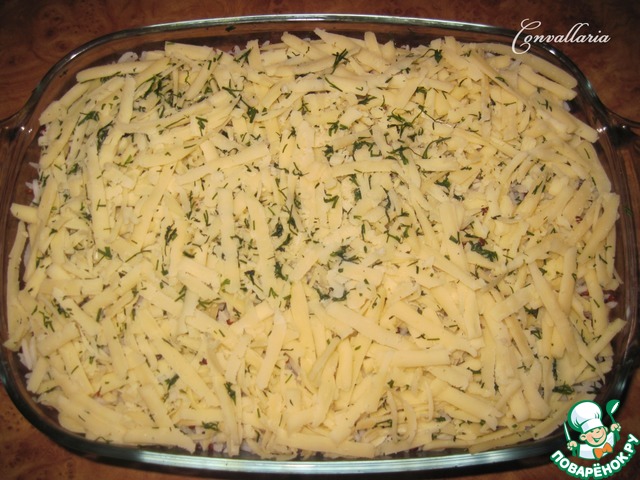 Сверху посыпать оставшимся натертым сыром с добавлением измельченного укропа.