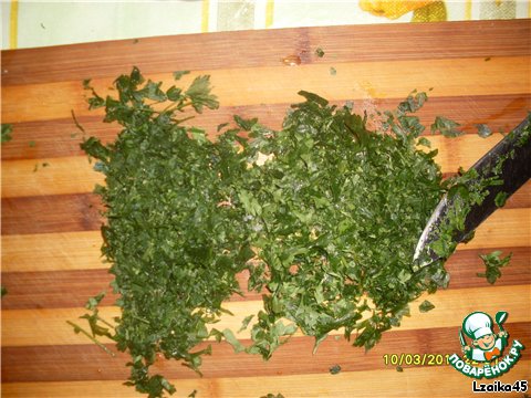 Тем временем делаем начинку. Петрушку мелко нарубить.