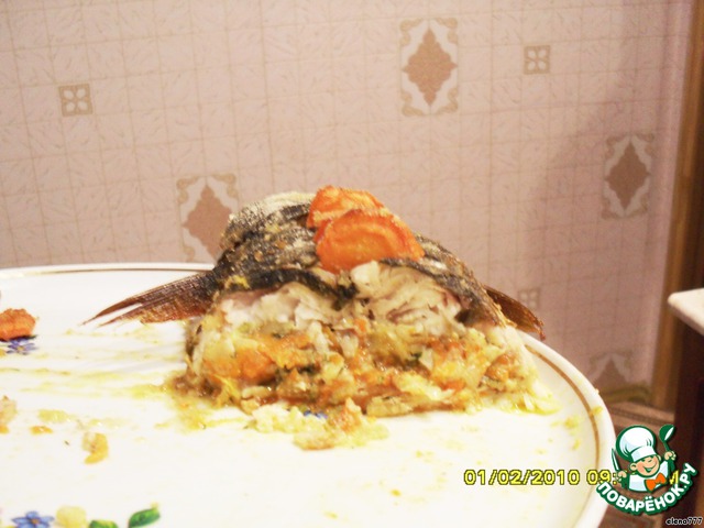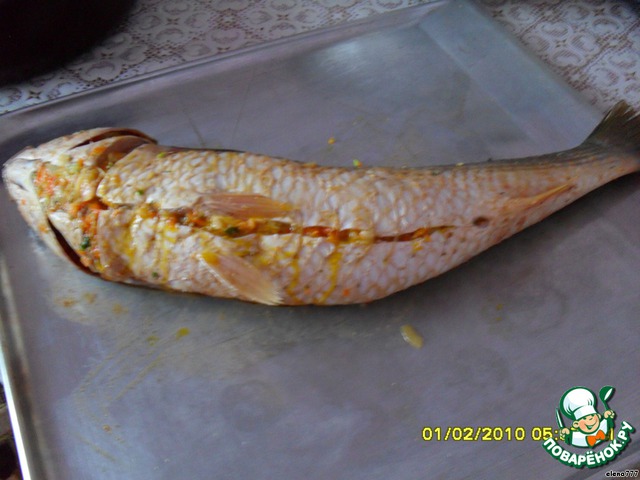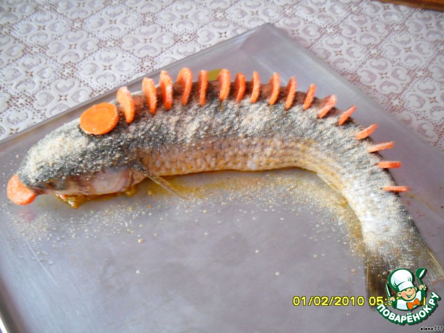 Рыбку перевернуть брюшком вниз, сделать сверху поперечные разрезы. Морковные монетки воткнуть в разрезы, одну "монетку" вставить в ротик нашей "Владычице". Переложить рыбу на смазанный противень, посыпать панировочными сухарями, поставить в разогретую духовку и запекать при температуре 180 градусов 45-50 минут.