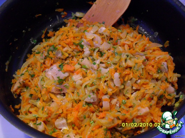 Пока рыбка и морковка маринуются, приготовим начинку. Морковь (2 шт.) натереть на крупной тёрке, 3 шт. лука порезать полукольцами и пожарить на растительном масле до полуготовности. Смешать овощи с сёмгой и зеленью, посолить и поперчить по вкусу. Потушить 2-3 минуты, всыпать манку (она придаст эффект икры), хорошо перемешать. Снять с огня и остудить.