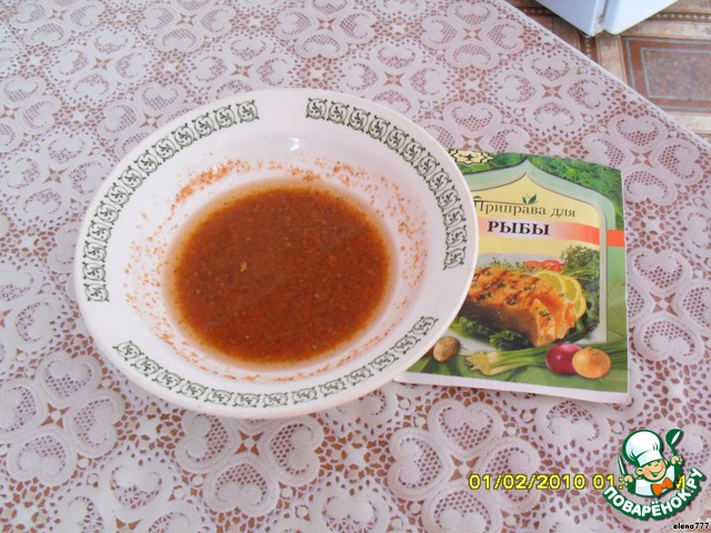 Приготовим соус: приправу для рыбы смешать с оливковым маслом и винным уксусом, добавить по щепотке соли и молотого чёрного перца, перемешать.