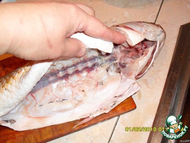 Рыбу почистить, разрезать брюхо, распотрошить, вынуть жабры.