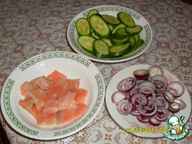 Для этого нам надо порезать огурцы вытянутыми кружками, лук - кольцами, малосольную сёмгу - кусочками.
