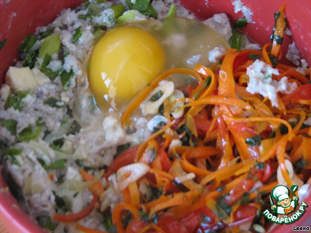 Рыбный фарш, 3 порубленных яйца, соль, одно сырое яйцо перемешиваем с припущенными овощами.