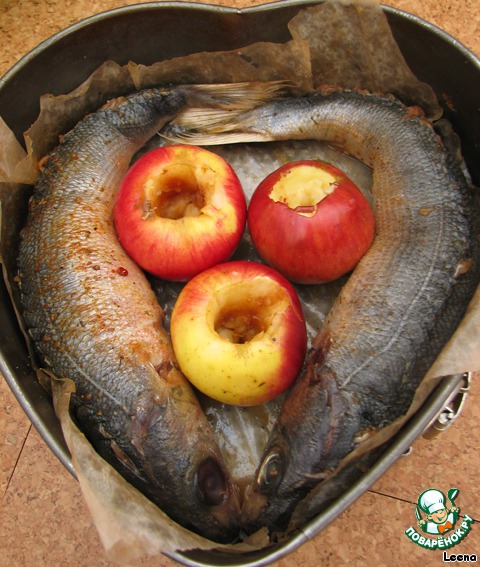 Рыбочку укладываем в форму для запекания (желательно, простелить пергаментную бумагу, смазанную маслом), посыпаем солью, чуть специями. И туда же помещаем несколько яблочек с вырезанной "стаканчиком" серединкой. Яблоки дадут сок и придадут необыкновенный вкус и аромат рыбке. Запекаем при 180 градусах минут 30. В общем, до румяности.
