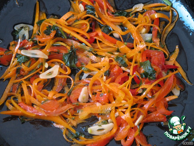 Подготовим фарш. Для этого тонко порежем морковь, перец, чеснок, добавим зелень, розмарин и кориандр. Все слегка припустим в сковородочке, просто чтобы овощи стали мягкими. Аромат ВОЛШЕБНЫЙ!!!