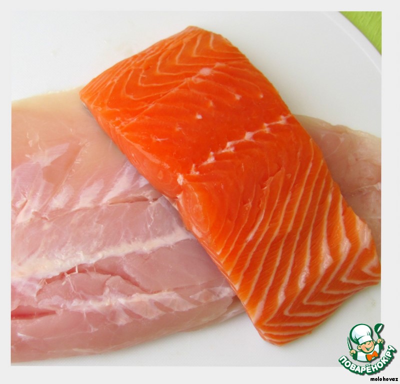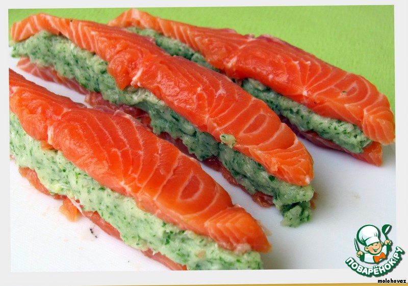 Лосось нарезаем аккуратными ломтиками (примерно, по 70г). На порцию - 2 ломтика. Нижний ломтик промазываем фаршем из белой рыбы и прикрываем другим. В оригинале, высота начинки 1см, но я положила больше фарша.