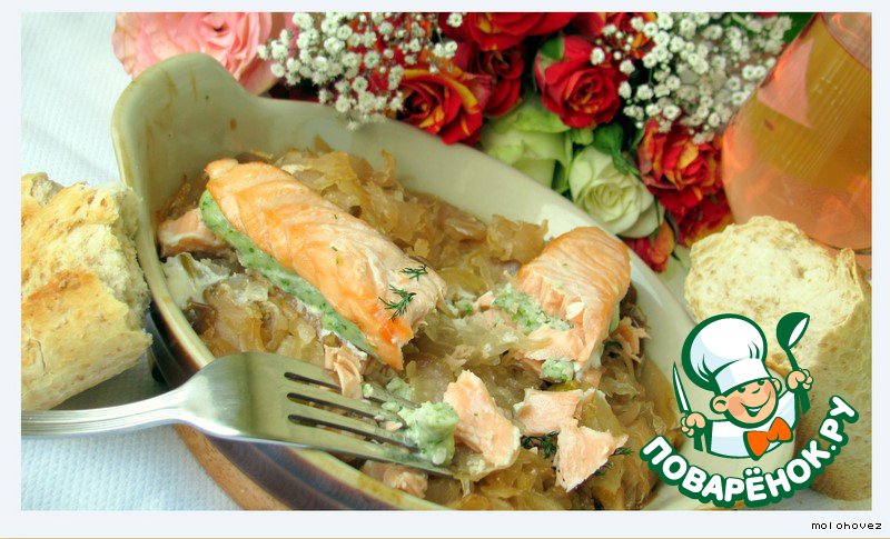 Сверху на капусту кладем рыбу. Маленькими кусочками распределяем оставшиеся 2 ст.л. сливочного масла. Ставим в разогретую духовку на 12-15 минут. Не передержать! Готовиться быстро и из-за пара от капусты начинка сочная.