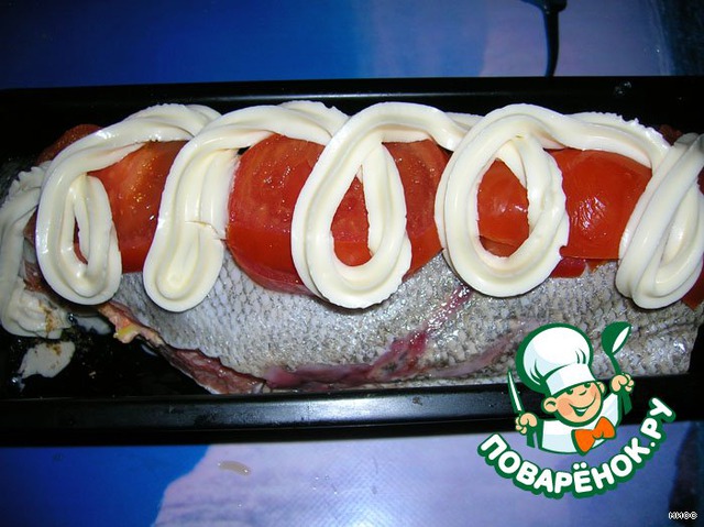 Режем на кружки помидор. Укладываем сверху рыбы, покрываем майонезом.