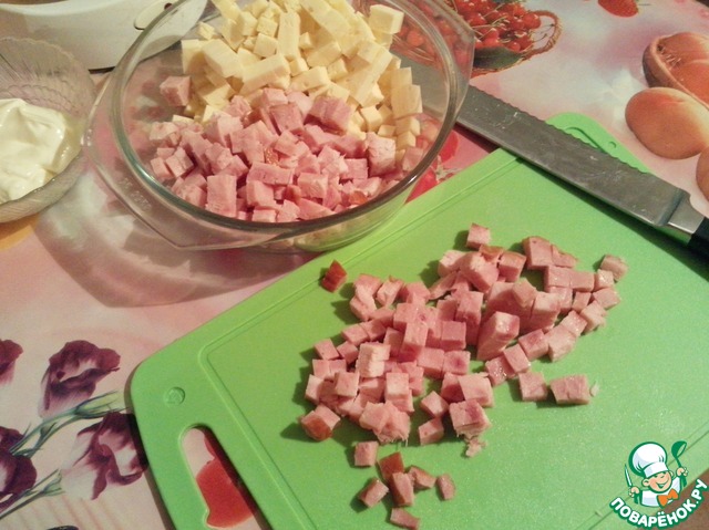 Порезать ветчину и сыр средними кубиками, заправить майонезом и перемешать