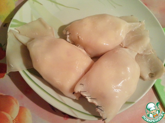 Кальмары нужно брать сырые, предварительно не нужно их варить. Ветчину и сыр для начинки брать равными пропорциями,