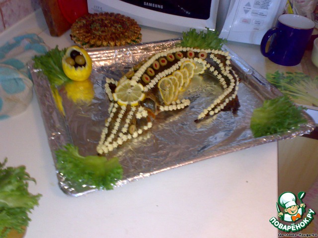На поднос выкладываем по середине рыбу,смазываем растительном маслом, чтобы она блестела.Берем листья салата отрезаем у ник нижнюю часть, кладем в 4 угла.