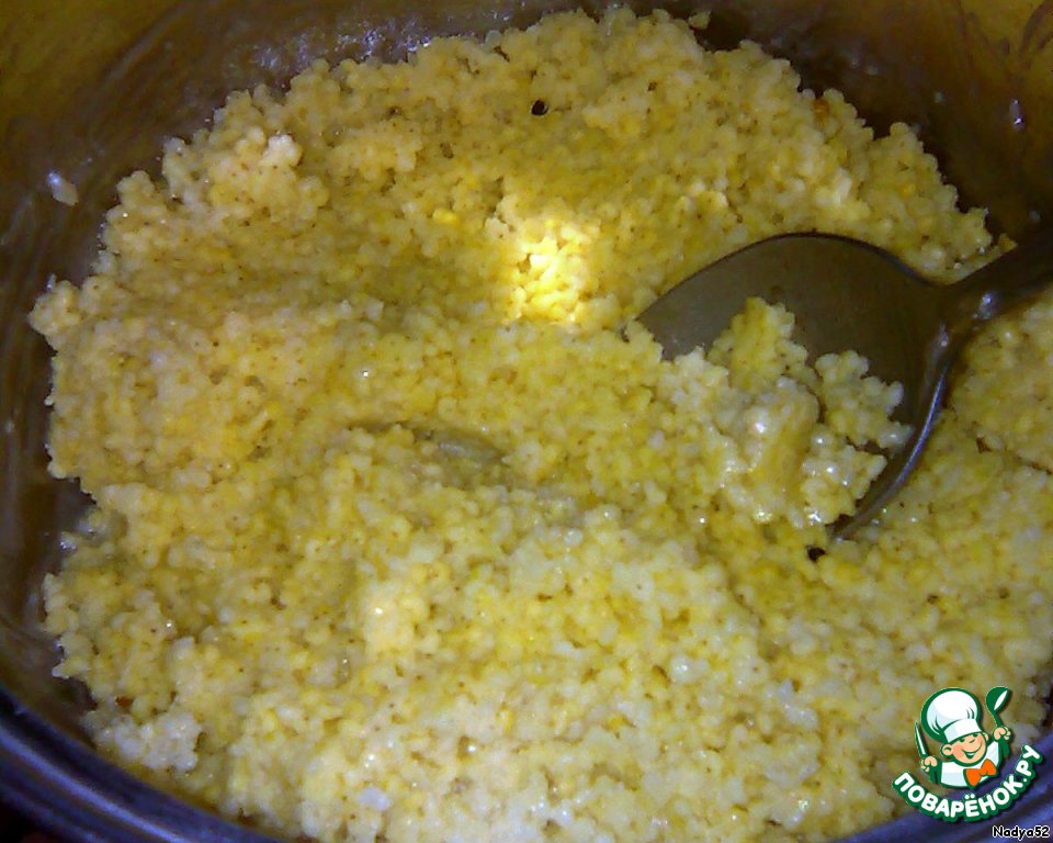 Промыть хорошо стакан крупы, я беру пшено, но можно и рис. Залить 2 стаканами воды, добавить 1 ч.л. соли, варить до полного впитывания воды, до полуготовности крупы.