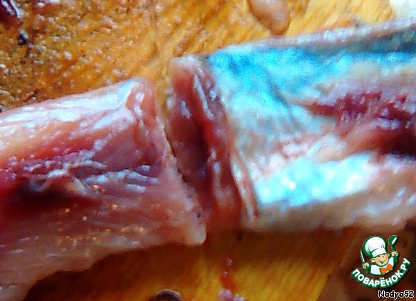 Дошли до хвоста рыбы, аккуратно отрезаем, чтоб хвостик и совсем маленькая часть хребта остались на шкуре.