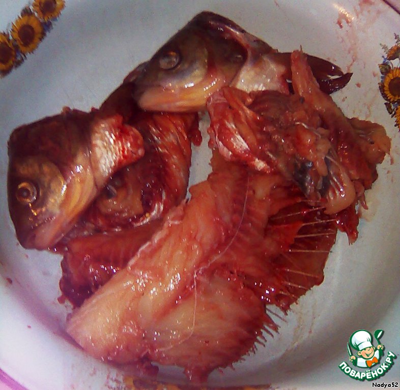Теперь отделяем голову, вычищаем внутренности. В чашку складываем то, что нам понадобится в дальнейшем- шкура, голова и собственно тело рыбы без кишок.