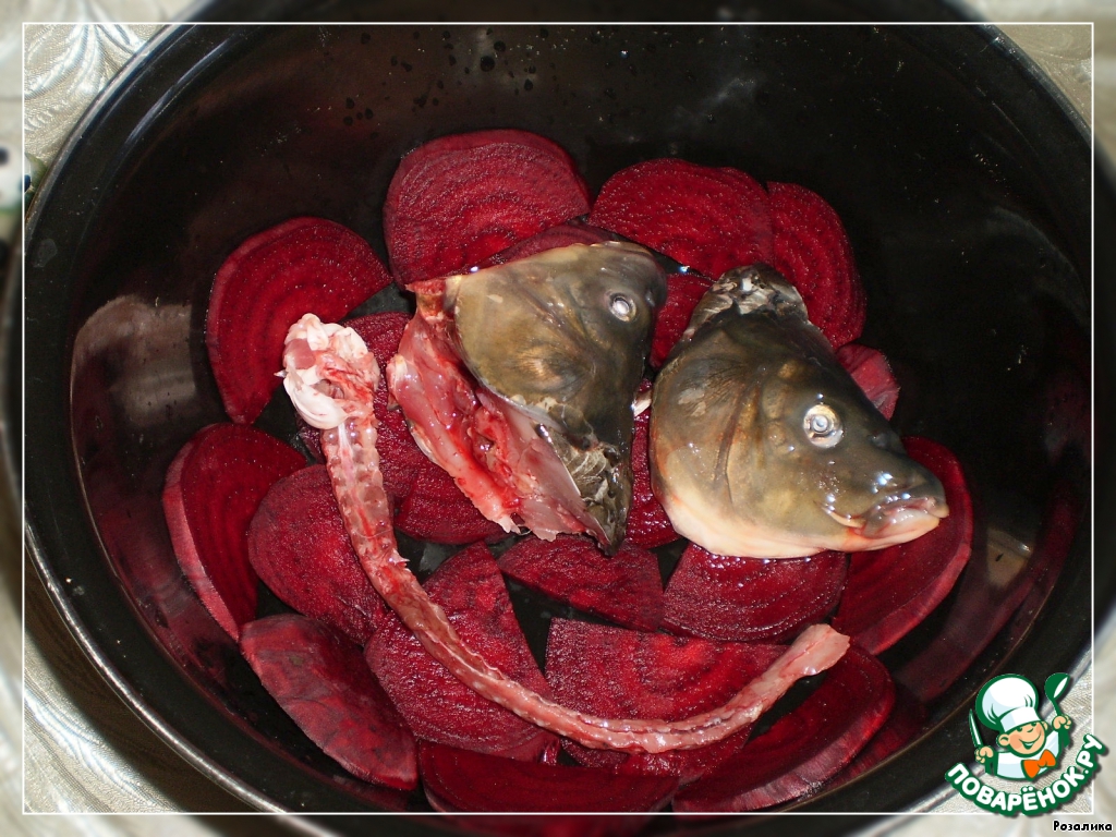 Залить холодной водой так, чтобы она покрывала рыбу и овощи,