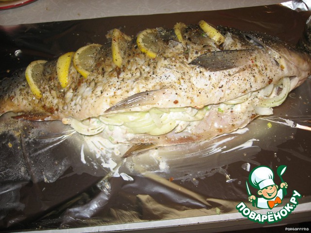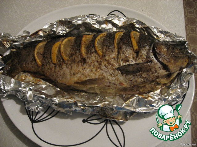 Где-то минут за 20 до конца приготовления я фольгу разрезала, чтобы карп немного подзолотился